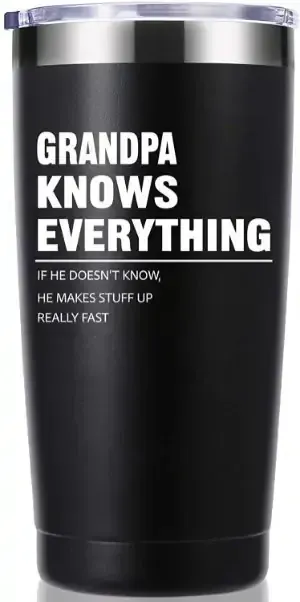 This 20oz tumbler travel mug is one of our favorite best grandpa gifts. The tumbler is made of stainless steel; it’s double-walled to keep drinks hot or cold for hours.