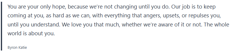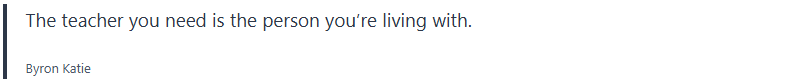 I just wanted to mention Byron Katie has been a real impact on my life and others I know who have read her books and put “The Work” into bettering themselves and transforming their lives.