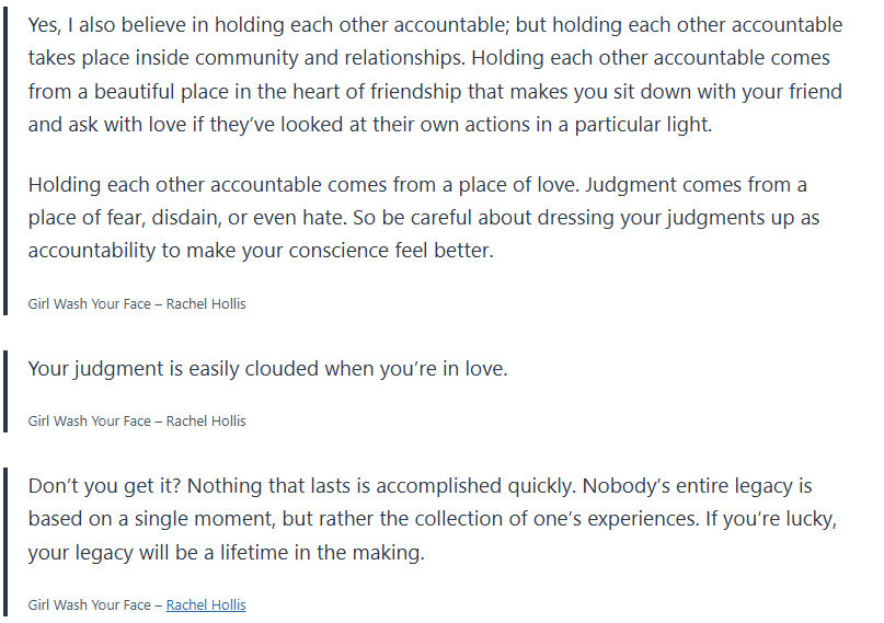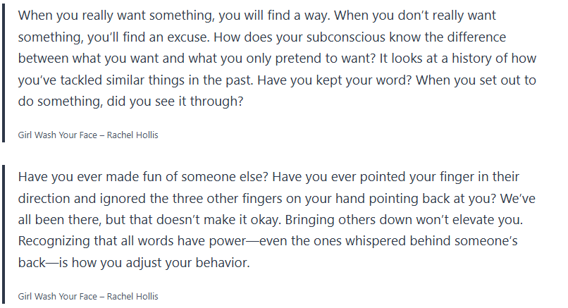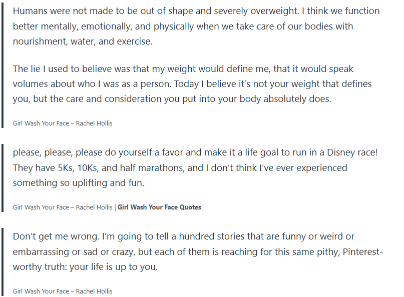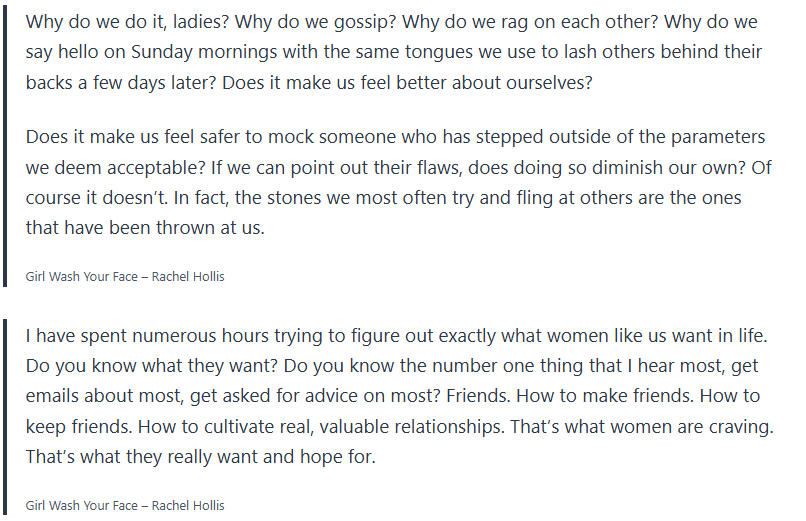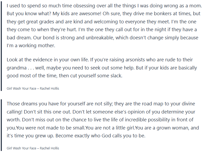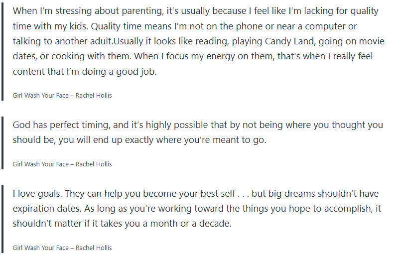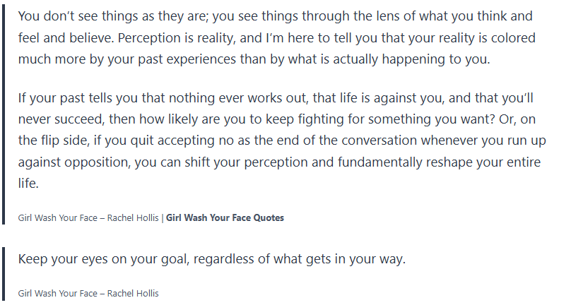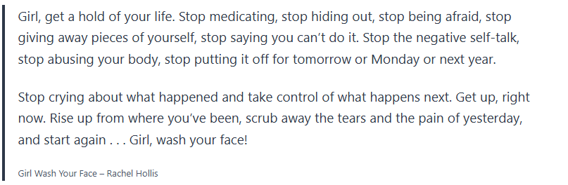Rachels book Girl, Wash Your Face is real, talks about real-life issues, and shares strategies that helped her move through rough times. She also reveals and exposes the lies and delusions holding you back from living a joyful and productive life.
